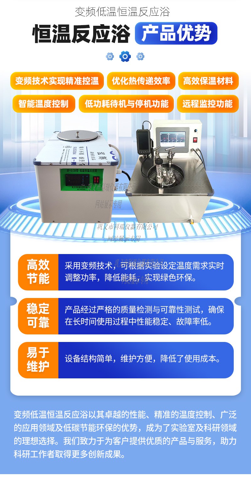 變頻低溫恒溫反應浴,具有顯著的節能降噪優勢。我司從2016年就開始致力于節能技術的研發,先后投資超過100萬元,成功研發出多項具有專利的技術成果。通過采用變頻技術,該設備可以根據實際運行需求,自動調節壓縮機的轉速和制冷劑流量,從而實現精準的溫度控制和高效的能量利用。通過大量實驗對比,變頻低溫反應浴與同規格傳統低溫反應浴相比,節電79.94%,噪音分貝也比傳統儀器要低。這不僅有助于降低設備的能耗和運行成本,還有助于減少對環境的影響,符合綠色發展的理念。隨著全球對節能減排的重視程度不斷提高,節能技術將在更多領域得到應用和推廣。我公司將繼續加強在節能技術研發方面的投入,不斷提升技術水平和創新能力,為客戶提供更加優質的產品和服務,為推動行業的技術進步和可持續發展做出更大貢獻。